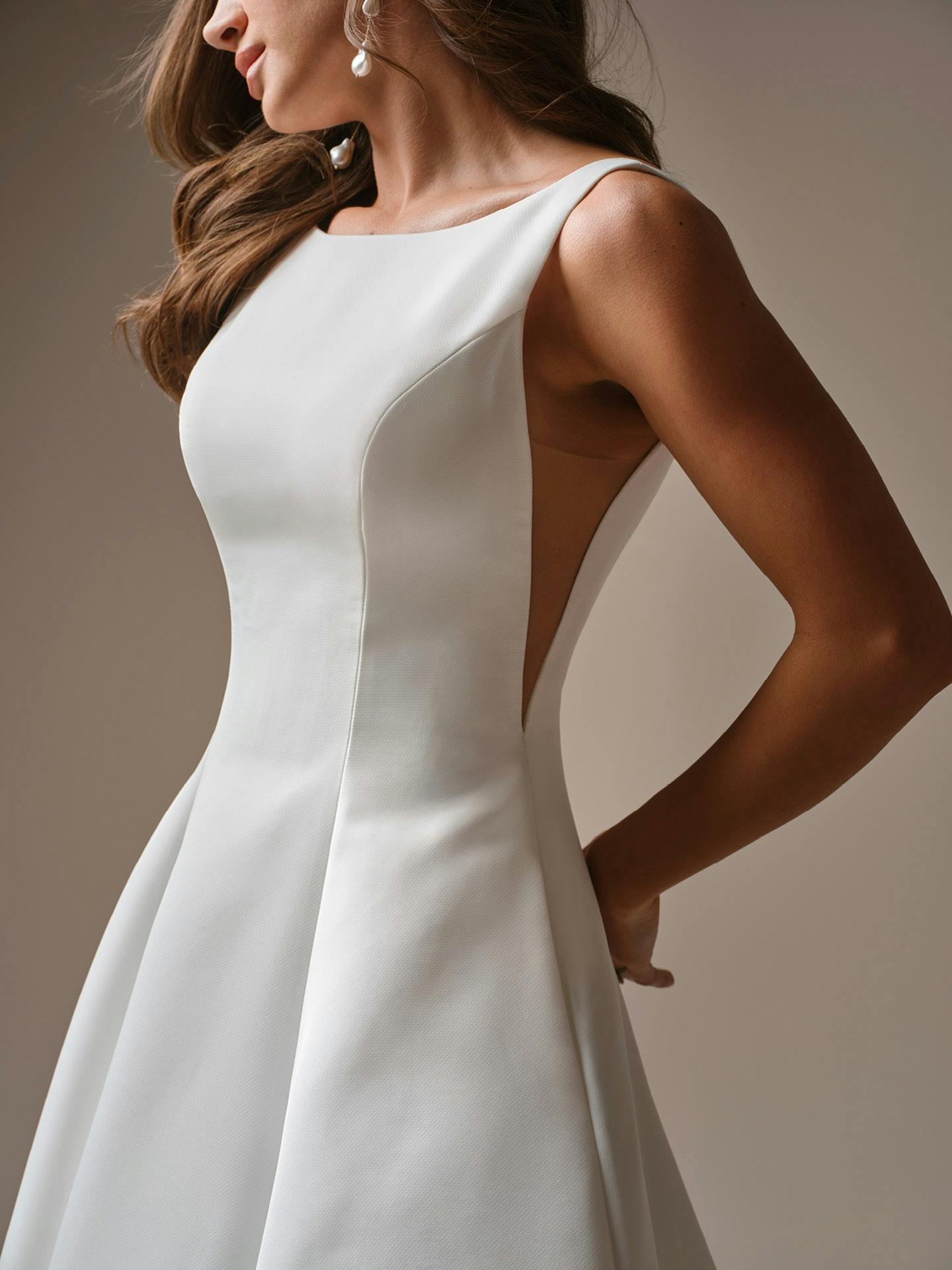 A bateau neck deep v-back satin wedding dress with stunning minimalism — AKA the solution to all your coverage, comfort, and bridal style dilemmas.