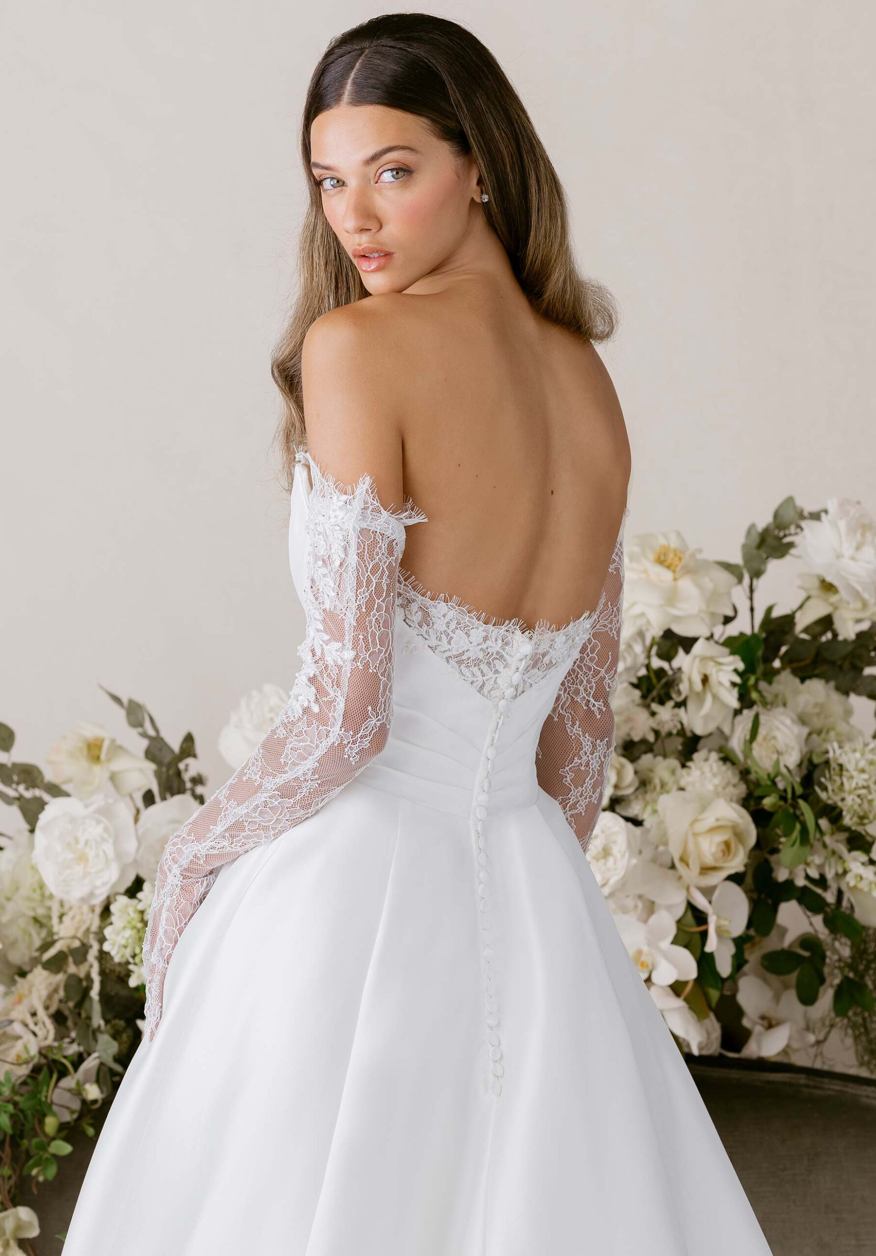 Soft and romantic, our Dove wedding dress is a ball gown that embodies quiet elegance. The strapless scoop neckline features a delicate lace peek-a-boo detail, adding a whisper of texture to the draped bodice. A softly pleated skirt flows with airy grace, creating a silhouette that moves like a gentle waltz, effortless, timeless, and poetic.