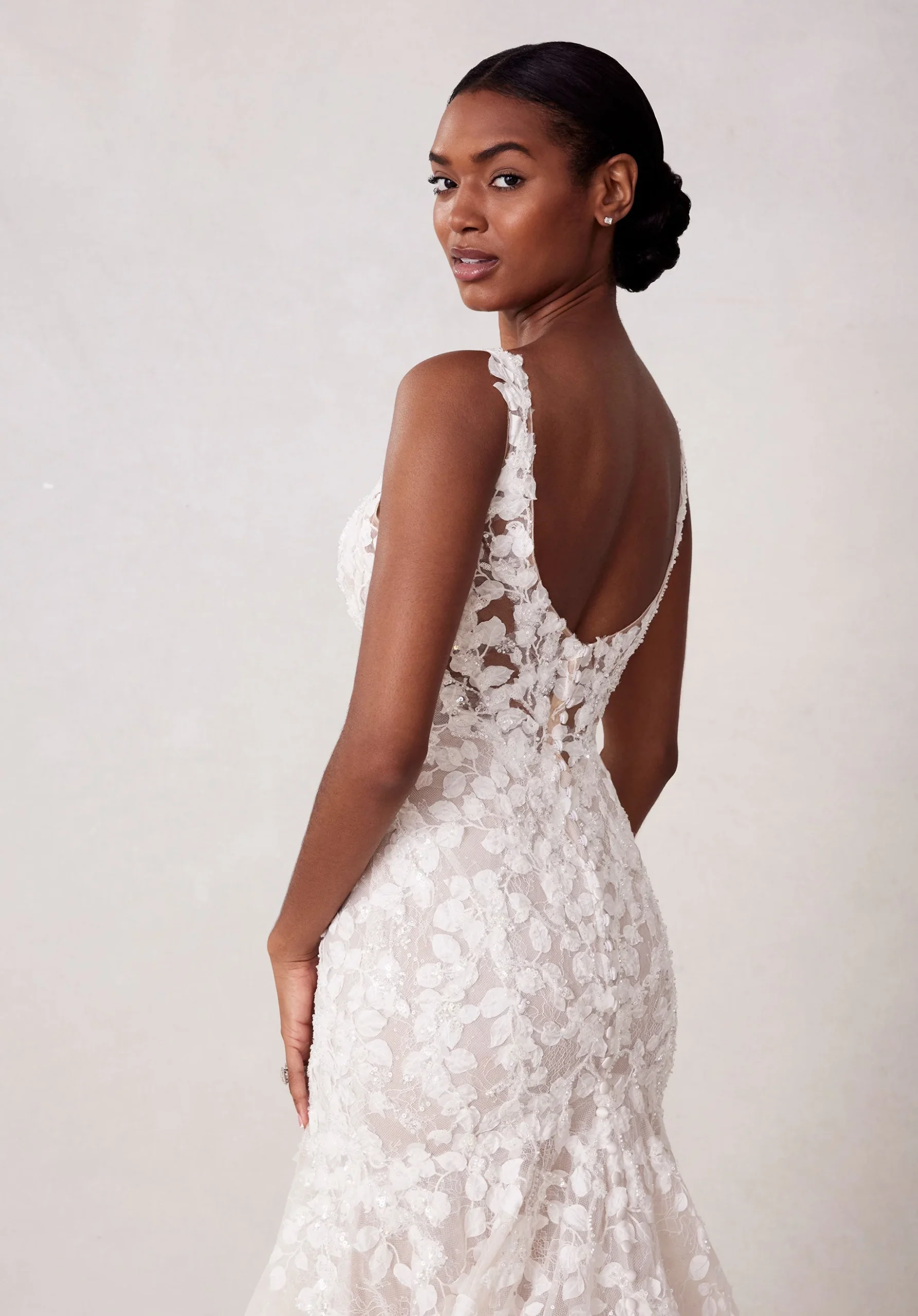Our Seraphina designer wedding dress is a maximalist mermaid dream featuring allover beaded, embroidered lace with three-dimensional appliqués over Chantilly lace with its delicate floral motif. The v-neckline has a sultry plunge and a soft scoop back with sheer detailing that highlights the botanical lace. The stunning skirt has a dramatic flare with buttons leading down to the chapel length train.