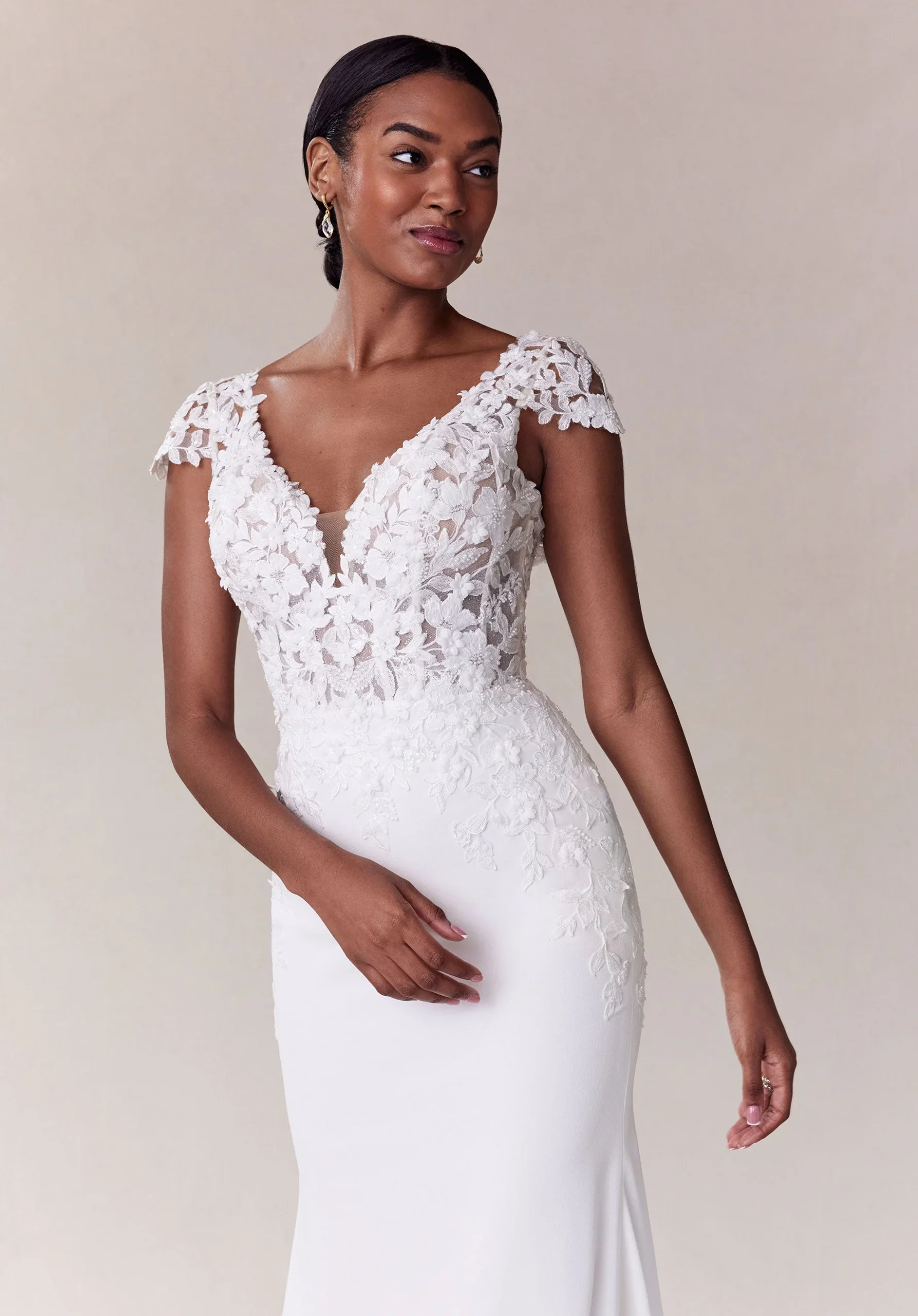 Clean wedding dress has v-neck bodice with embroidered lace and 3D floral appliqués on a crepe skirt with floral lace cut out train.